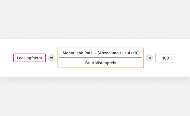 ((Rate + (Anzahlung / Laufzeit)) / Bruttolistenpreis) *100 = Leasingfaktor